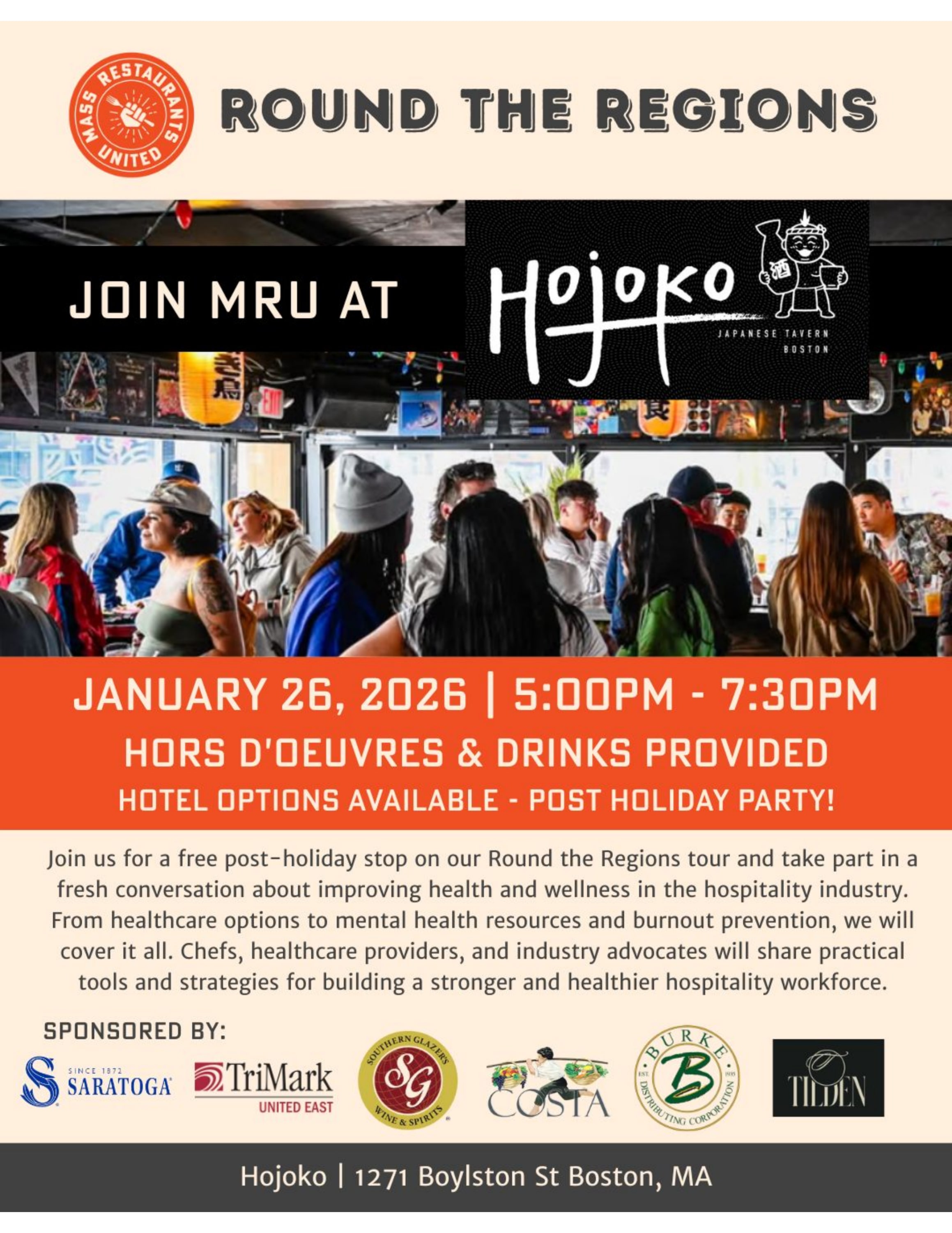 Mass Restaurants United (MRU) is bringing its Round the Regions series to Boston with a post-holiday gathering at Hojoko Japanese Tavern on Mon. Jan. 26 (5–7:30 p.m.).