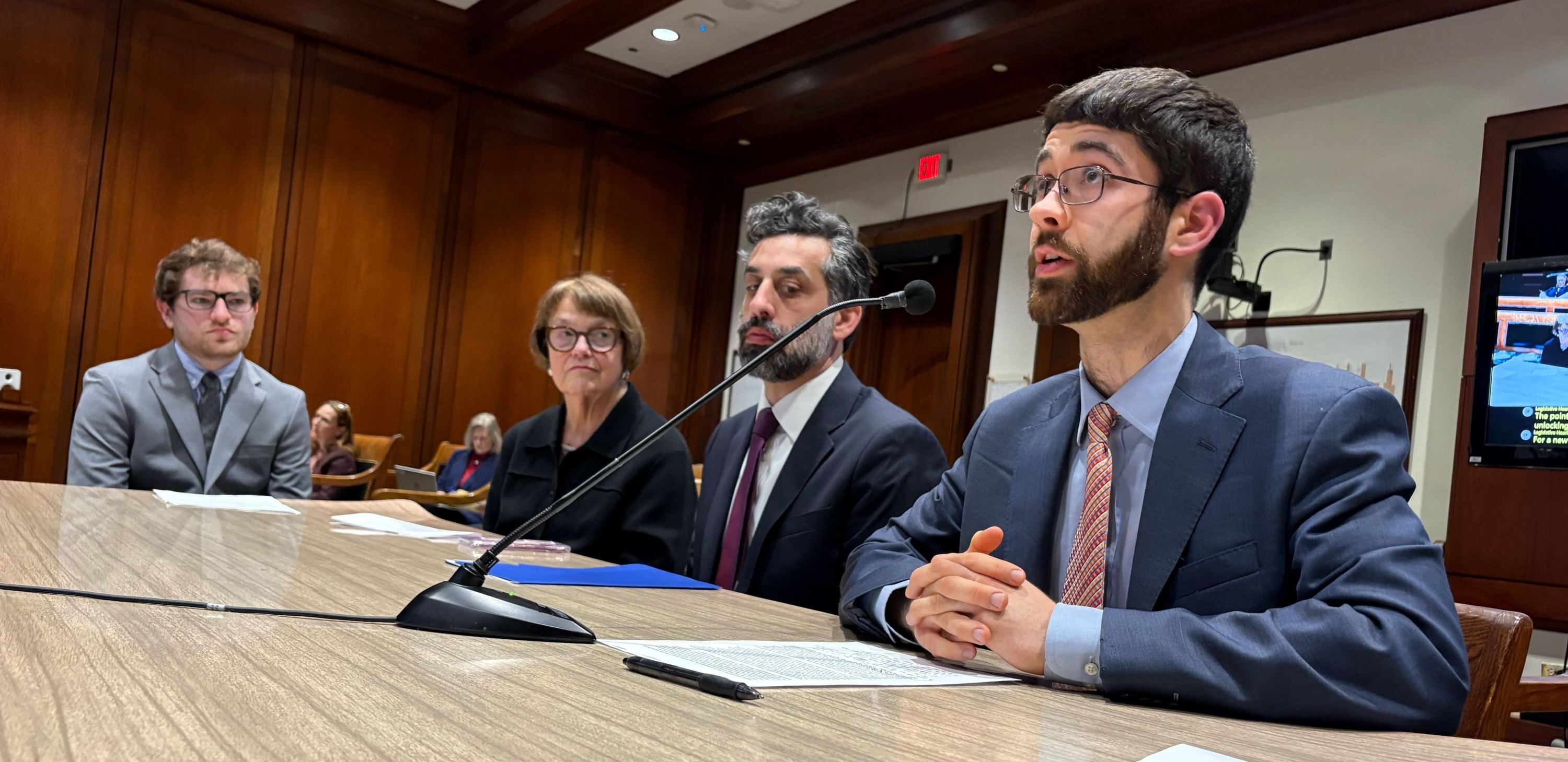 From left, the chamber’s Max Woolf, Sherri Kassier from Building A Better Wellesley, Jesse Kanson-Benanav from Abundant Housing MA and Andrew Mikula of the Starter Home campaign testify Monday on Beacon Hill.